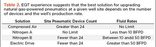 EQT, the largest natural gas producer in the U.S., recently released a roadmap for implementing their wellsite instrument upgrade projects, and other companies can learn from their experience. Their approach considers three alternatives: installing air compressors to run the existing pneumatic instrumentation and valves, using nitrogen to run the existing instrumentation and valves, or replacing the instrumentation and valves with electric devices. The best option for any given well site usually depends upon the number of natural gas-powered devices, as well as the production rate of the well, Table 2. High production rates typically require each valve to stroke more often, so these types of wells tend to vent more methane in normal operation.