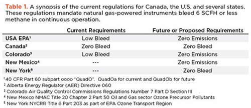 In response to this issue, both the U.S. and Canadian governments have passed regulations to curtail these types of methane emissions. The requirements of Canadian, U.S., and several U.S. state laws are shown in Table 1. “Low Bleed” instruments must bleed <6 SCFH of natural gas in normal operation. Zero Bleed requirements are often not well-defined in regulations, but they are generally understood to require intermittent venting only, or zero bleed at a steady state. These devices have a continuous bleed rate of zero but vent intermittently during valve operation. Zero Emission devices vent no natural gas at all.