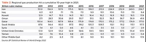 Middle East oil production, excluding Egypt, averaged 24.625 MMbpd in 2021, up a mere 2% over pandemic-riddled 2020 (Table 1), according to the BP 2022 Statistical Review of World Energy (World Oil carries a figure of 24.765 MMbpd, up 1.5%). Total gas production, however, hit a 10-year high of 714.9 Bcm (Table 2), with 2022 seeing a regionwide increase in production and exports, partly in response to Russia's retaliatory cutback to Europe. "We are focusing on new LNG import capacity in Europe," Shell CEO Ben Van Beurden said on July 28, three weeks after acquiring a stake in the world's largest liquefied natural gas (LNG) expansion project under development in Qatar.