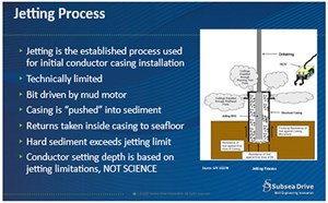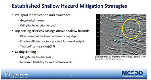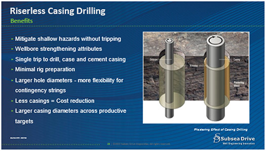 Riserless casing drilling technology in the deepwater top hole interval can provide effective mitigation and isolation of deepwater shallow hazards. This shift in deepwater well construction allows deepwater riserless casing setting depths, based on prevailing pore pressure and fracture gradients, as opposed to the established strategy of “top setting” shallow hazards.
