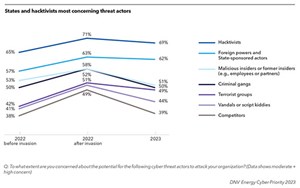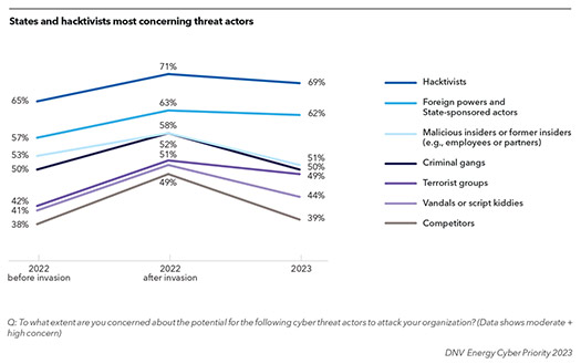 Our research shows how the profile of cyber-attackers in the energy industry has changed since early 2022. In the immediate aftermath of Russia’s invasion of Ukraine, we saw an increase in the perceived threat posed by all forms of threat actors, in the two weeks following the invasion in February 2022. In the year since, energy executives remain highly attuned to the threat created by the Ukraine war—either by politically-driven hacktivists or by hostile states—but they appear to have returned to pre-invasion levels of concern about longer-term adversaries, such as criminal gangs and malicious insiders, Fig. 2.