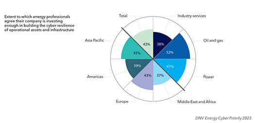 Only half (52%) of oil and gas professionals believe their company is investing enough in building up the cyber resilience of operational assets and infrastructure. While this is higher than for the power and renewables sector (47%) and companies providing services across the energy industry (38%), it still leaves around half of energy professionals believing their organization needs to invest more, Fig. 1.