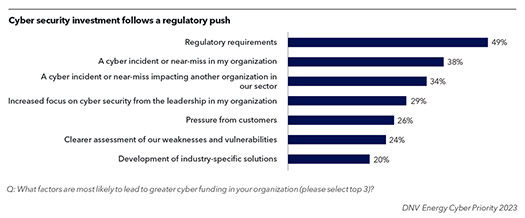 Regulatory requirements are the foremost driver of investment in cybersecurity within the oil and gas sector and the wider energy industry. Almost half (49%) of energy professionals say that changing regulatory requirements is one of the factors most likely to unlock increased budget, with the next nearest catalyst being a cyber incident (or near miss), as cited by 38%, Fig. 4.