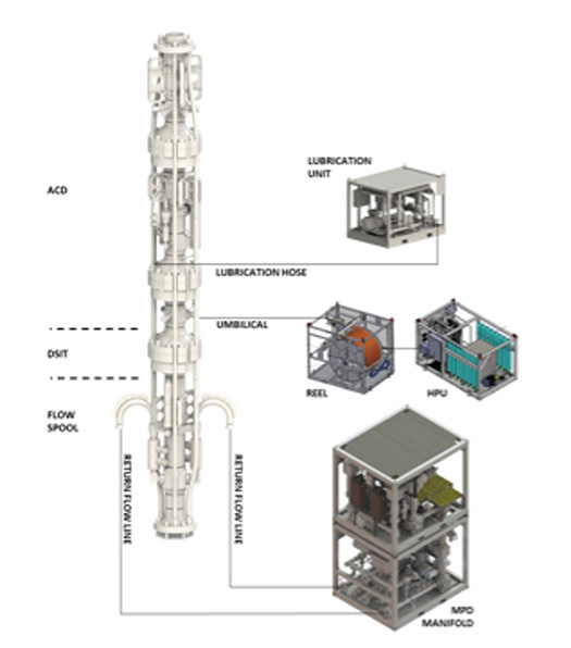 The active control device is part of a larger MPD system, as illustrated in Fig. 2. An ACD typically forms a portion of an MPD specialty joint that runs in the drilling riser, just below the termination joint. The MPD specialty joint includes an ACD, a drillstring isolation tool (DSIT), and a flow spool. When the ACD or DSIT annular packers are closed, returning drilling fluid is diverted through a pair of API 17K hoses to the MPD manifold at the surface. Additional support equipment, such as the hydraulic power unit (HPU) and umbilical reel, provides power and communications to the subsea joint.