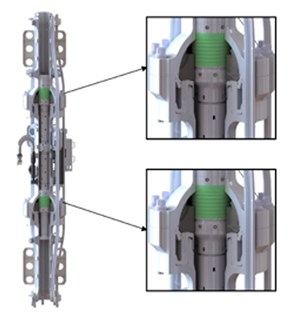 NOV developed an active control device (ACD) (Fig. 1) to address the limitations of passive sealing devices in deep water. The active control device uses dual spherical annular packer elements—similar to those found in a BOP—to actuate a dual, non-rotating seal sleeve element. An active control system, which enables closing pressure monitoring and optimization over the life of the seal sleeve element, controls the annular packers. Two seal sleeve elements are made up into a seal sleeve assembly, which drillstring-deployed tools run and retrieve. The seal sleeve elements use a unique co-molding construction technique, in which a wear-resistant polytetrafluoroethylene (PTFE) honeycomb insert is molded with a flexible polyurethane buffer material. The system contains no rotating parts and uses a durable polymer seal insert to absorb the wear caused by pipe motion within the element.