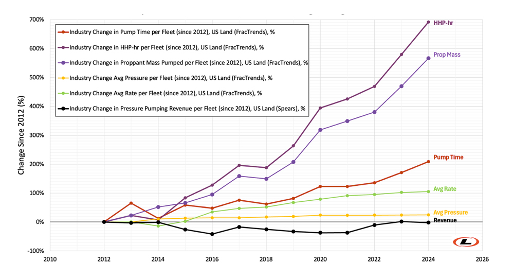 A summary of these improvements is shown in Fig. 1. As mentioned before, pump time for frac is up 3x since 2012, while frac jobs are done at a higher average rate and at a higher overall surface pressure. The product of these three parameters is work done, or horsepower-hours, which is up about 700% for every U.S. frac crew since 2012. The most stunning part: for a dedicated frac crew for a year, the cost for an E&P Company is unchanged.