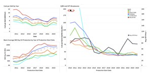But ultimately it is not about productivity. It is not about cost. It is about production economics. The simplest way to express that, without incorporating a time value of money, is the cost to produce a barrel of oil. In Fig. 3, we have slightly modified this to mean the drilling and completion cost to produce the barrels in the first 365 days of a well’s productive life. The benefit of that metric is that we can measure it (after a year), and that we don’t have to resort to a modeling exercise.