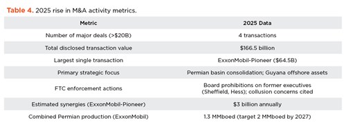 January 2025 saw the Federal Trade Commission grant final approval to two very large oil and gas mergers: ExxonMobil’s $64.5 billion acquisition of Pioneer Natural Resources and Chevron’s $53 billion purchase of Hess Corporation, Table 3. The approvals came with significant conditions—FTC Chair Lina Khan barred Pioneer CEO Scott Sheffield from serving on ExxonMobil’s board after uncovering “troubling evidence” of communications with OPEC representatives, aimed at cutting oil production to raise prices.