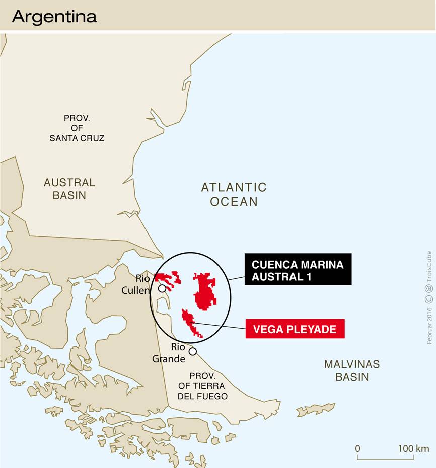 Vega Pleyade is in the Cuenca Marina Austral 1 (CMA-1) concession operated by Total with a 37.5% interest, alongside its partners Wintershall Energia (37.5%) and Pan American Energy (25%).