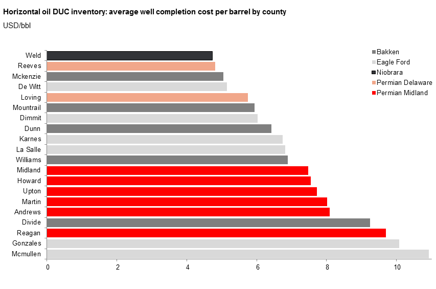 Rystad estimates that the DUC inventory in Weld County turns economical at an average WTI price of just $30/bbl. Other counties that exhibit favorable fraclog economics are Reeves County in the Permian Delaware and McKenzie County in the Bakken, with average completion costs of $4.80/bbl and $5.10/bbl, respectively.