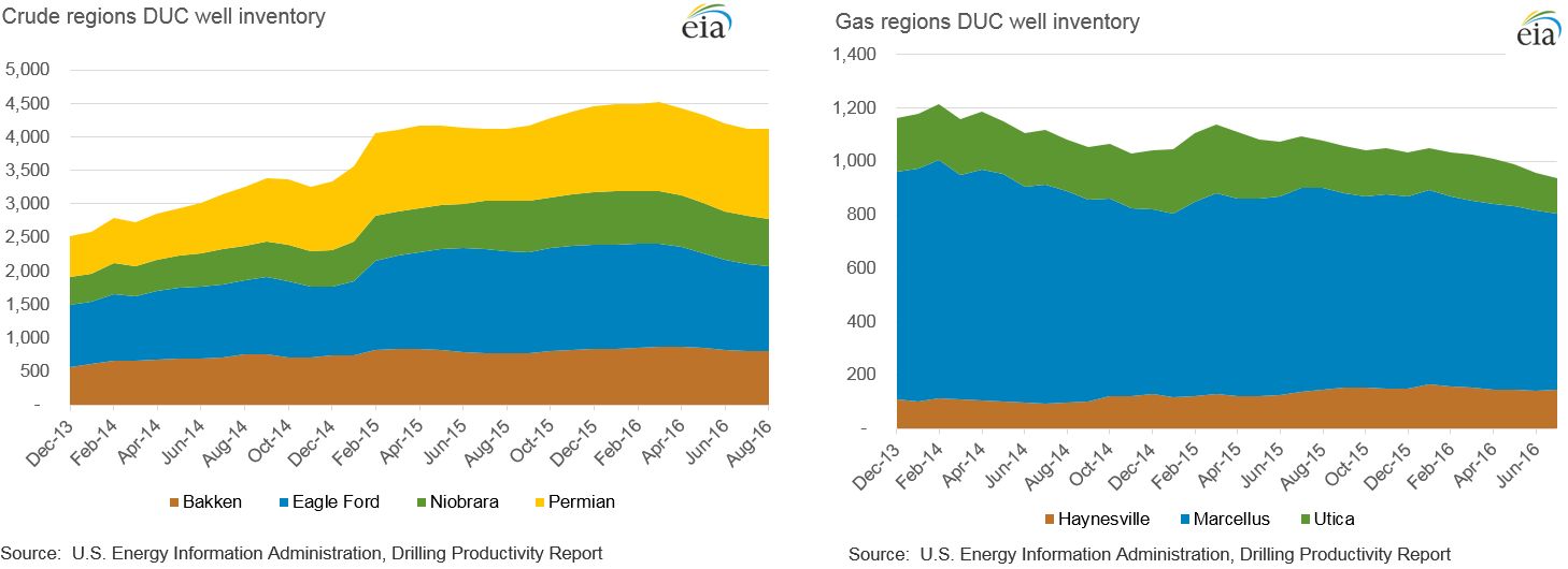 Current EIA estimates show DUC counts as of the end of August totaling 4,117 in the four oil-dominant regions and 914 in the three gas-dominant regions that together account for nearly all U.S. tight oil and shale gas production. In the oil regions, the estimated DUC count increased during 2014-15, but declined by about 400 over the last 5 months.The DUC count in the gas regions has generally been in decline since December 2013.