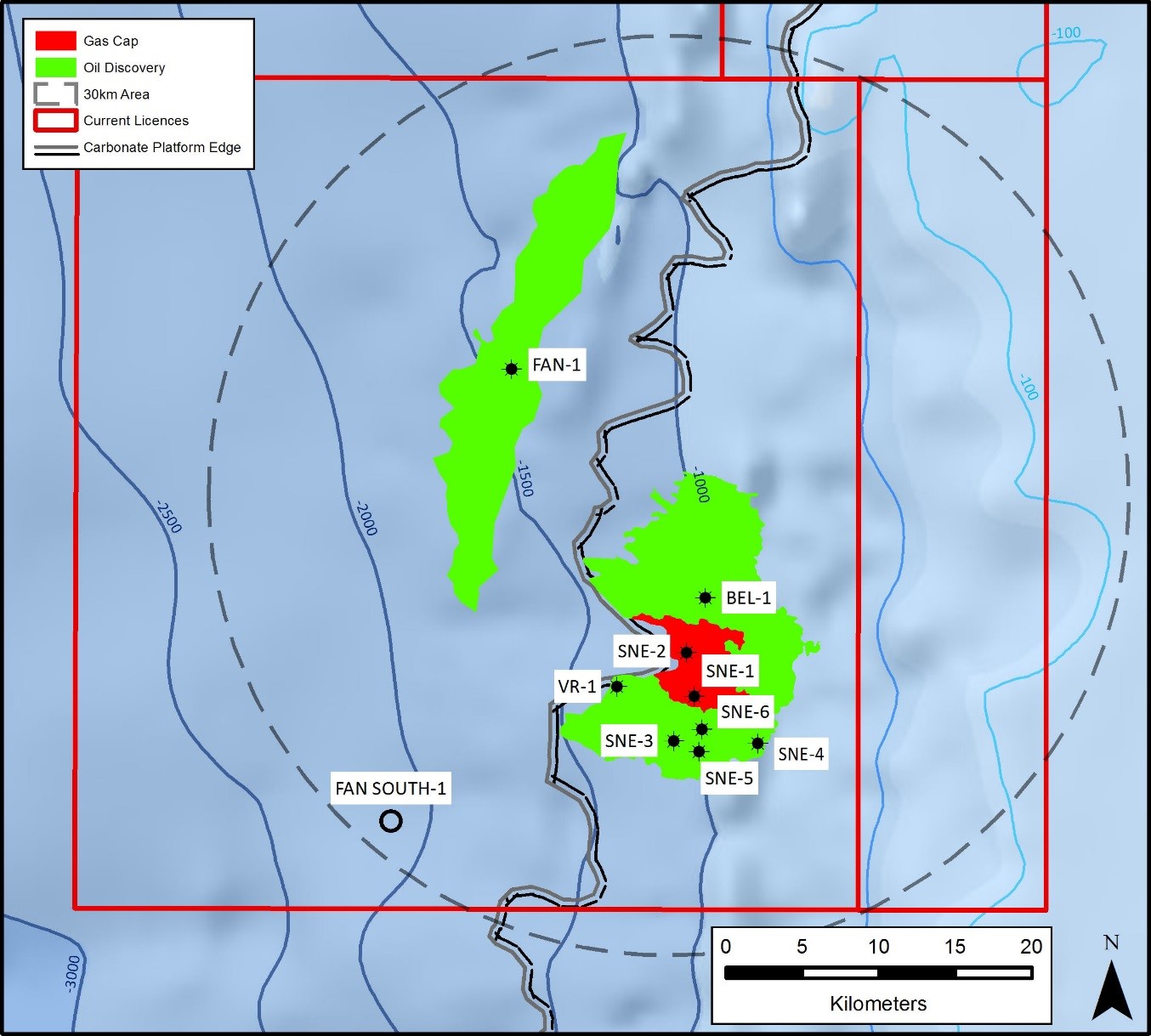 SNE-6 is being plugged and abandoned and the Stena DrillMAX drillship is moving location to commence operations at the FAN SOUTH exploration well, ~20 km southwest of the SNE-3 well in ~2,175 m water depth. FAN SOUTH is targeting a mean prospective resource of more than 110 MMbbl with dual prospects; an Upper Cretaceous stacked multi-layer channelized turbidite fan prospect and a Lower Cretaceous base of slope turbidite fan prospect, which is equivalent to the FAN-1 2014 oil discovery.
