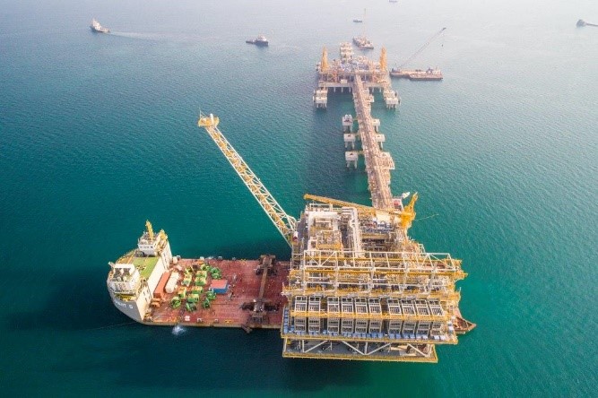 The topside was fabricated in Thailand and loaded out onto the Giant 5 barge prior to loading the barge onto Zhenhua 15 semisubmersible vessel for ‘piggyback’ transport to Bahrain. The topside installation was completed following the barge offload in Bahrain.