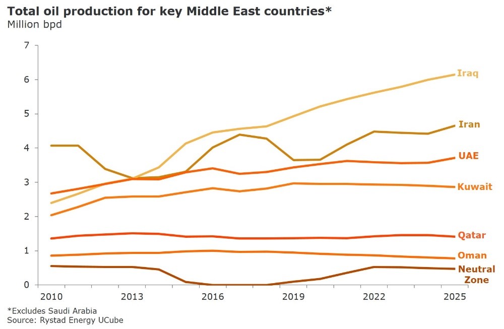 OSLO -- Middle Eastern oil production is expected to grow by 2.7 MMbpd by 2025, according to latest Rystad Energy analysis. The boost in conventional oil output from the Middle East is primarily driven by supply additions from Iraq with 1.5 MMbpd growth, and an additional 1.2 MMbpd mainly coming from the Neutral Zone, the UAE and Iran in the medium term.