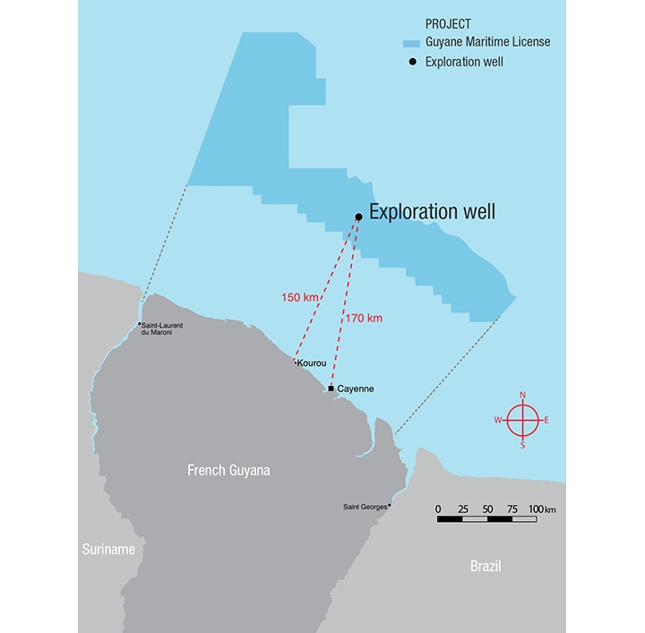 Paris -- Total is ready to start its exploration campaign on the Guyane Maritime license, located 93.2 mi (150 km) off the French Guiana coast, in the days following the arrival of the drilling ship on site, as authorized by the prefectoral decree dated October 22, 2018.