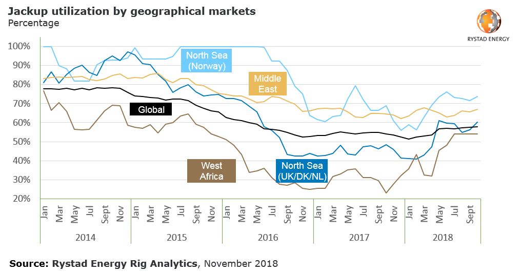 NORWAY -- Since 2014, global jackup utilization has fallen from almost 80% to around 55%, where it has remained quite steady over the last two years. There have, however, been large regional differences with regards to jackup utilization over the past four to five years, and several regions are now seeing promising developments.