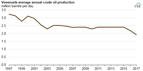 WASHINGTON, D.C. -- Venezuela’s crude oil production has been on a downward trend for two decades, but it has experienced significant decreases over the past two years. Crude oil production in Venezuela decreased from 2.3 MMbpd in January 2016 to 1.6 MMbpd in January 2018. A combination of relatively low global crude oil prices and the mismanagement of Venezuela’s oil industry has led to these accelerated declines in production.