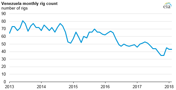 Several factors indicate that Venezuela’s crude oil production will likely continue to decline. The number of active rigs has fallen from near 70 in the first quarter of 2016 to an average of 43 in the last quarter of 2017. Recent reports indicate that missed payments to oil service companies, a lack of working upgraders, a lack of knowledgeable managers and workers, and declines in oil industry capital expenditures have also contributed to production declines.
