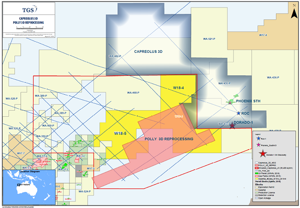 "The combination of the Capreolus 3D with the neighboring reprocessed Polly 3D dataset provides E&P companies with modern contiguous 3D data linking the current Dorado-1 oil discovery to the Acreage Release blocks W18-4 and W18-5 currently on offer," stated Kristian Johansen, CEO, TGS.