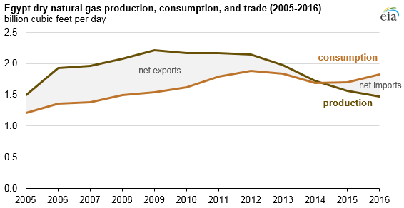 WASHINGTON, D.C. -- Natural gas production in Egypt has been in decline, falling from a 2009 peak of 5.8 Bcfd to 3.9 Bcfd in 2016, based on estimates in BP’s Statistical Review of World Energy. The startup of a number of natural gas development projects located offshore in the eastern Mediterranean Sea near Egypt’s northern coast has significantly altered the outlook for the region’s natural gas markets. Production from these projects could offset the growing need for natural gas imports to meet domestic demand, according to the Egyptian government.