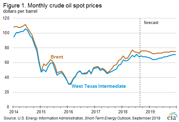 WASHINGTON, D.C. -- In the September 2018 update of its Short-Term Energy Outlook (STEO), the U.S. Energy Information Administration (EIA) increased the forecast price for the Brent spot price to $73/bbl in 2018 and $74/bbl in 2019. EIA expects West Texas Intermediate (WTI) crude oil prices will average about $6/bbl lower than Brent prices in 2018 and in 2019.