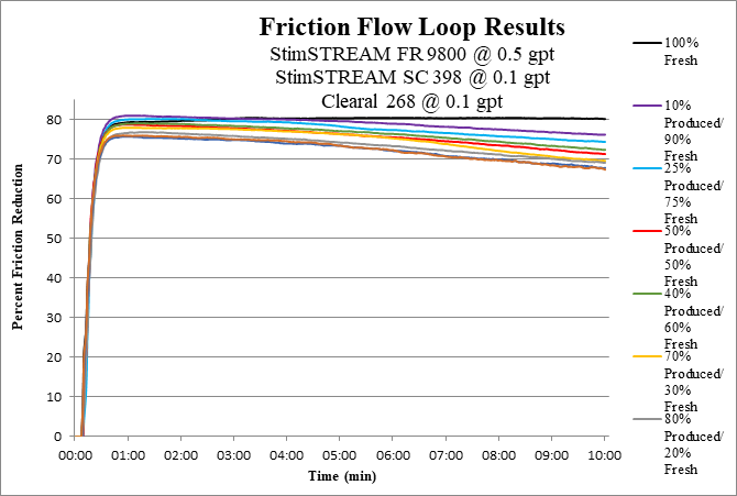 The unique StimSTREAM FR 9800 Nano-Dispersion viscosifying technology has allowed for up to a 40% reduction in FR usage while maintaining lower pumping pressures at rates exceeding 100 bpm. The technology has proved to be effective in all hydraulic fracturing water quality scenarios, as shown in the graph.