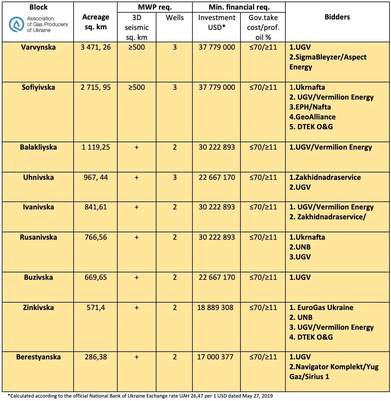 The company that has made the most bids is UGV, with 9 applications, 5 single and 4 joined with Vermilion Energy. In addition, four Ukrainian producers made 2 bids each (UNB, Ukrnafta, DTEK, Zakhidnadraservice). Also, one bid was pointed by each U.S. Sigma/Aspect, Czech EPH, and Ukrainian companies GeoAlliance, Navigator Komplekt and EuroGas Ukraine.