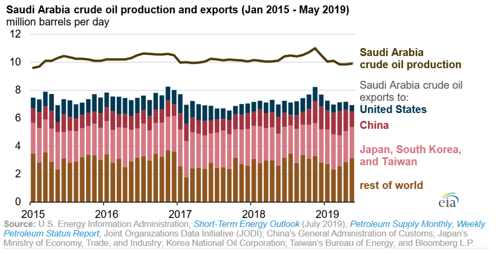 WASHINGTON - The U.S. Energy Information Administration (EIA) reports that Saudi Arabia’s crude oil production approached a four-year low in May 2019, averaging an estimated 9.9 MMbpd, more than 1 MMbpd lower than its all-time high in November 2018. Production in Saudi Arabia dropped following a December 2018 agreement by members of the Organization of the Petroleum Exporting Countries (OPEC) to cut crude oil production. Saudi Arabia’s crude oil exports, especially to the United States, have also fallen. However, some countries—in particular, China—have increased their imports of crude oil from Saudi Arabia.