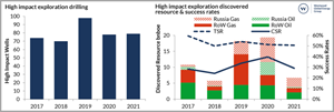 While high impact drilling levels in 2021 were similar to 2020, performance sank significantly, with discovered resource dropping 65% in 2021 to 6.7bnboe. The commercial success rate also fell 11% year-on-year, from 40% to 29%. This is due to a reduced number of giant discoveries >500mmboe and some unsuccessful play extension tests in recently opened emerging basins.