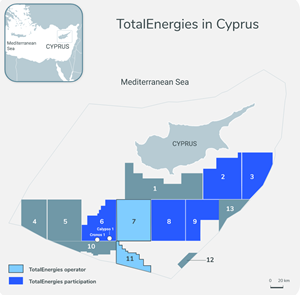 In Cyprus, TotalEnergies is also present in offshore Block 11 (50%, operator), 7 (50%, operator), 2 (20%), 3 (30%), 8 (40%) and 9 (20%).