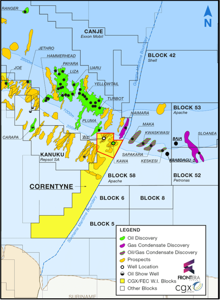 (WO) – CGX Energy Inc. and Frontera Energy Corporation, the majority shareholder of CGX and joint venture (the “Joint Venture”) partner of CGX in the Petroleum Prospecting License for the Corentyne block offshore Guyana, announced the discovery of a total of 114 ft (35 m) of net pay at the Wei-1 well on the Corentyne block, approximately 200 km offshore from Georgetown, Guyana.