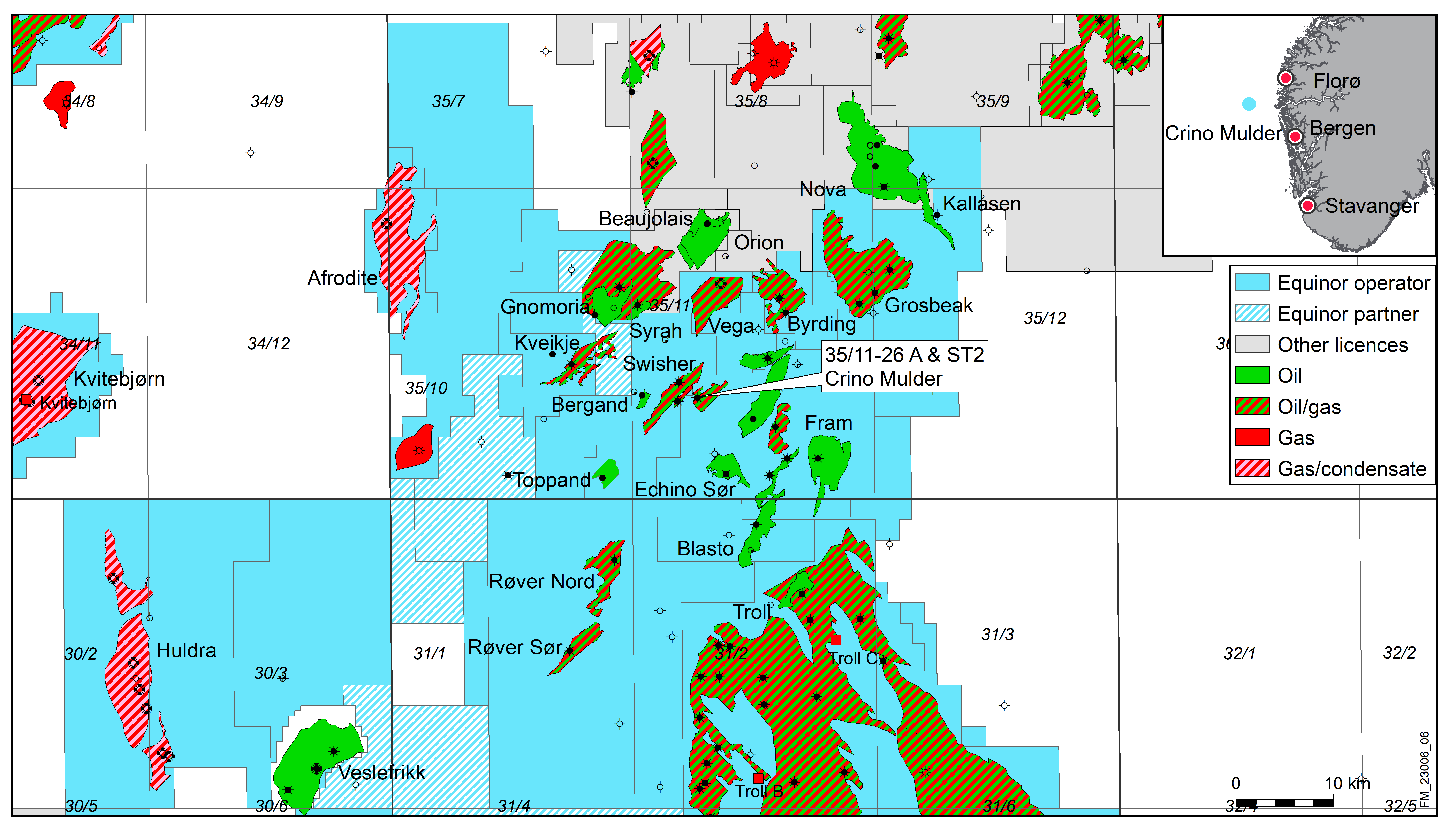 One exploration well with a side-track has been drilled in the Crino/Mulder prospect, about 4 km west of the Fram field and 130 km northwest of Bergen.