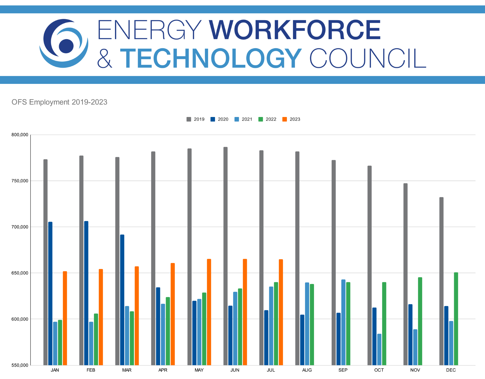 (WO) — Employment in the U.S. oil field services and equipment sector decreased by 117 jobs, remaining steady as the labor market and economy slows. Even with a slight loss in July, jobs in the sector remain above 665,000, totaling 665,016, according to preliminary data from the Bureau of Labor Statistics (BLS) after adjustments to June numbers and analysis by the Energy Workforce & Technology Council (Energy Workforce). The BLS adjusted June numbers showed a slight dip from preliminary reports of 665,258 to 665,133. Employment across the sector is holding steady, but still off the pre-pandemic level of 706,528 in February 2020.