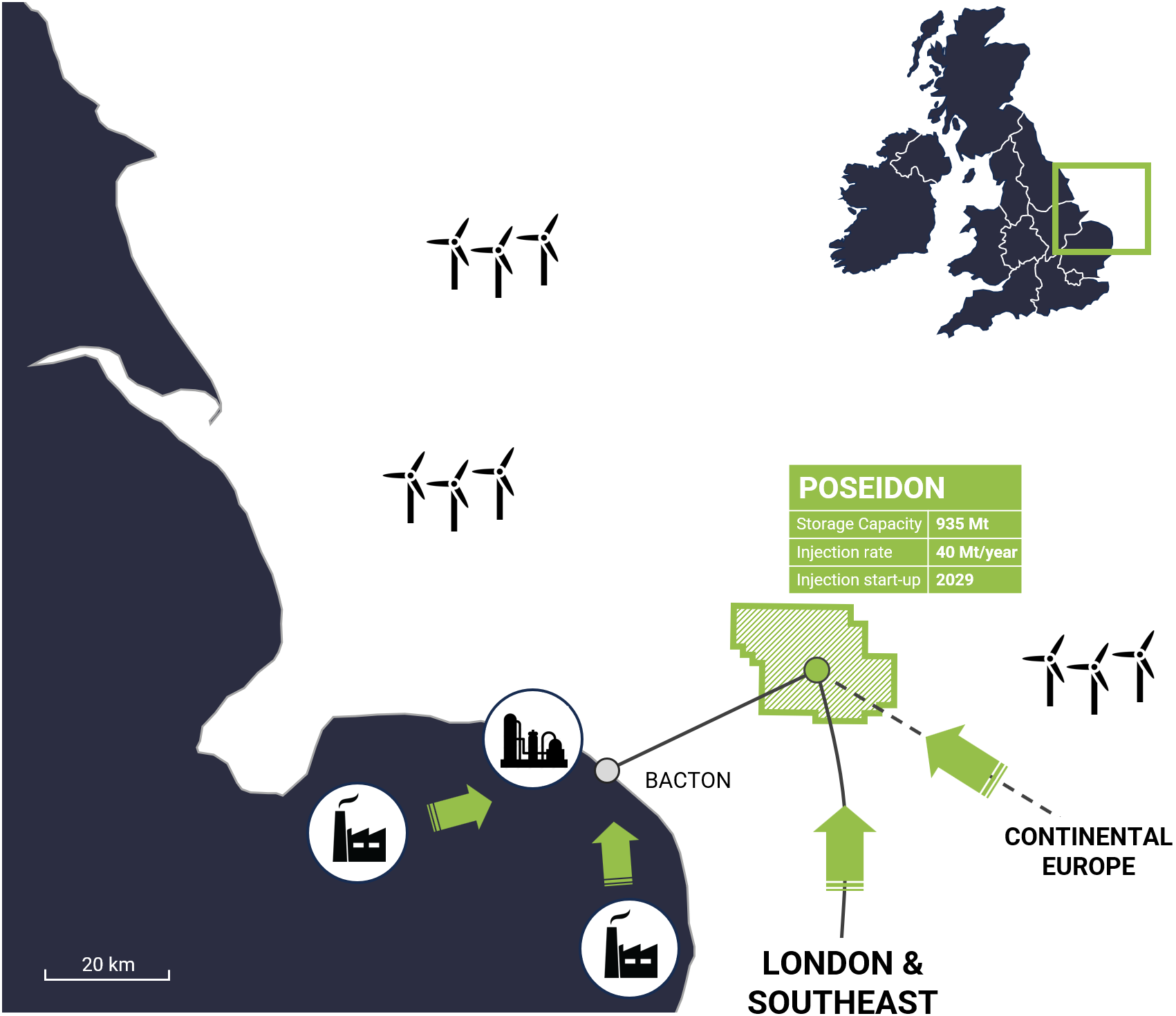 Poseidon envisions the permanent geological storage of approximately one billion tonnes of carbon dioxide (CO2) into the UK's largest depleted gas field, the PUK-operated Leman gas field, and other adjacent storage reservoirs within the carbon storage license. The project is scheduled to be operational by 2029, with initial CO2 injection rates of 1.5 million tonnes per annum (MMtpa), increasing to 40 MMtpa over a 40-year period. Poseidon will connect a wide range of CO2 emitters across East Anglia, London, and the wider Southeast of the UK via the PUK-operated Bacton Gas Terminal to the offshore Poseidon geological storage sites.