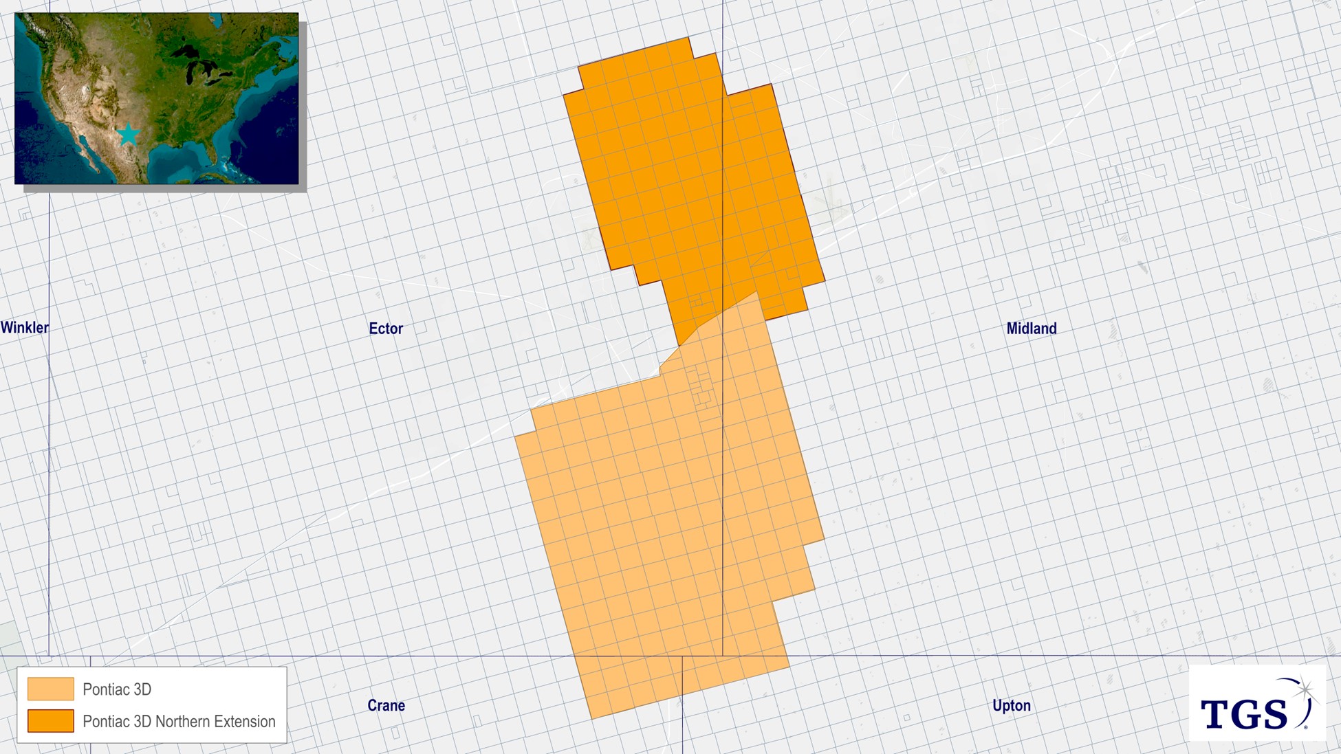 (WO) – TGS announced a Northern extension to its previously announced Pontiac 3D Survey in the Midland basin. The extension increases the size of the Pontiac 3D from 167 miles2 to a total of approximately 267 miles2 and is located in Midland, Ector, Upton and Crane counties, Texas.