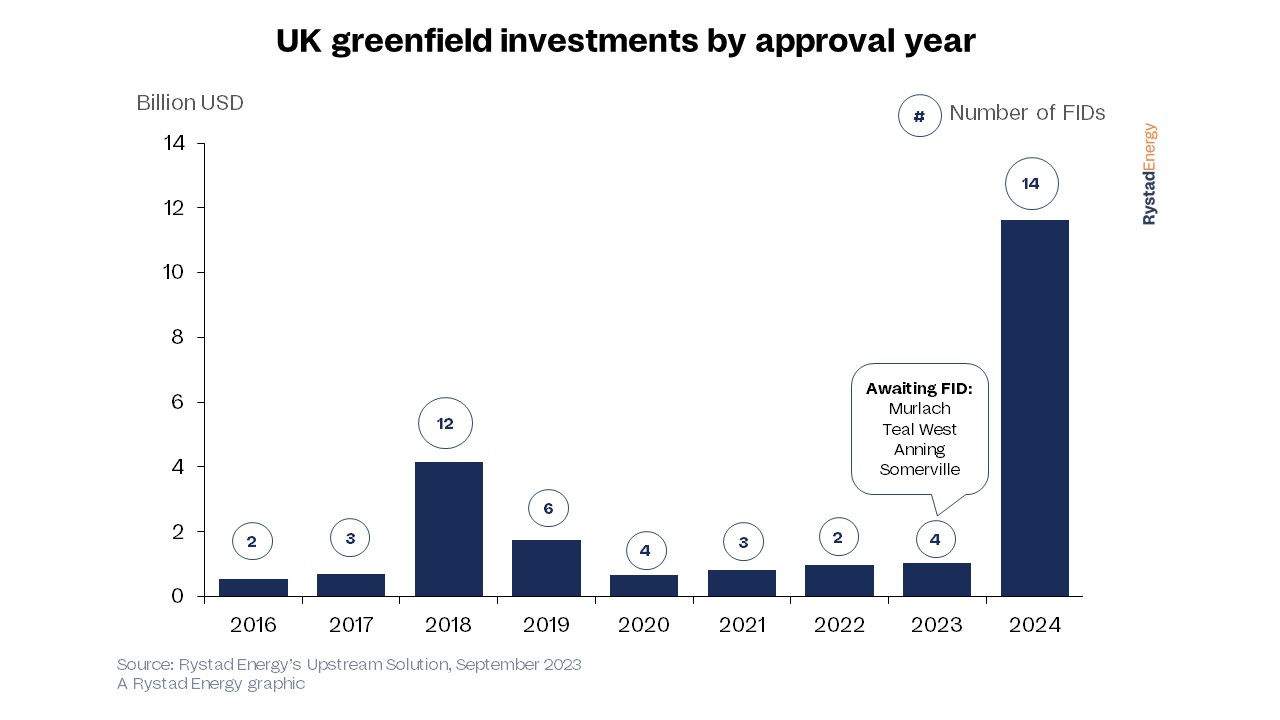 “The three largest projects are Rosebank, Cambo and Clair Phase 3. If these major projects get approved, 2024 could mark the highest sanctioning activity since 2013, with around £9.5 billion ($12 billion) in future investments,” says Sonya Boodoo, Upstream Senior Analyst at Rystad Energy.