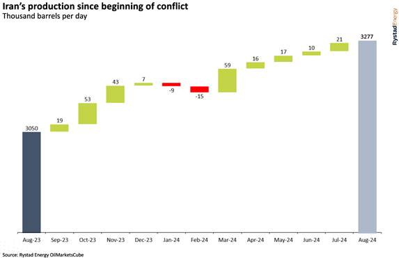 Iran’s production has steadily risen over the past year, unaffected by the conflict. Production at the end of last year jumped by about 122,000 bpd compared to mid-2023. The uptick continued this year as production increased by about 227,000 bpd to 3.27 million bpd in August compared to same month last year. Future production is expected to remain stable in the case of no direct attack.
