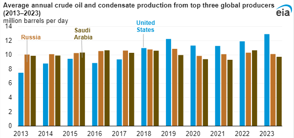 EIA also reported that the U.S., Saudi Arabia and Russia accounted for 40% of global oil production in 2023. This equates to 32.8 MMbpd. These three countries have produced more oil than any others since 1971.