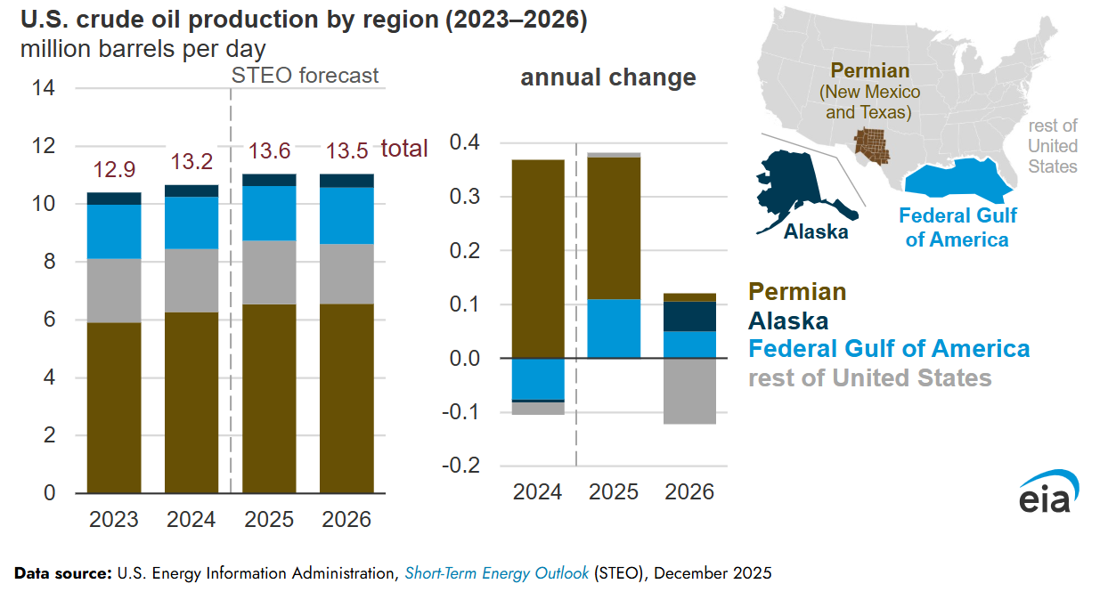 The EIA expects modest increases from Alaska, the Federal Gulf of Mexico, and the Permian basin to be offset by declines in other producing regions.