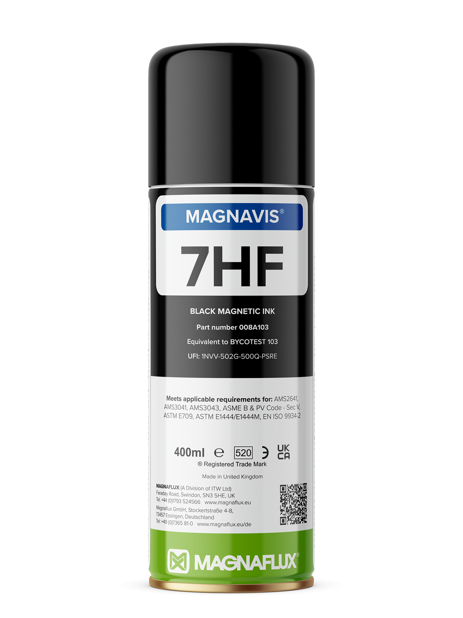 A highly-sensitive oil-based magnetic particle aerosol for nonfluorescent (visible) wet method magnetic particle testing to locate fine and medium discontinuities on finished parts.