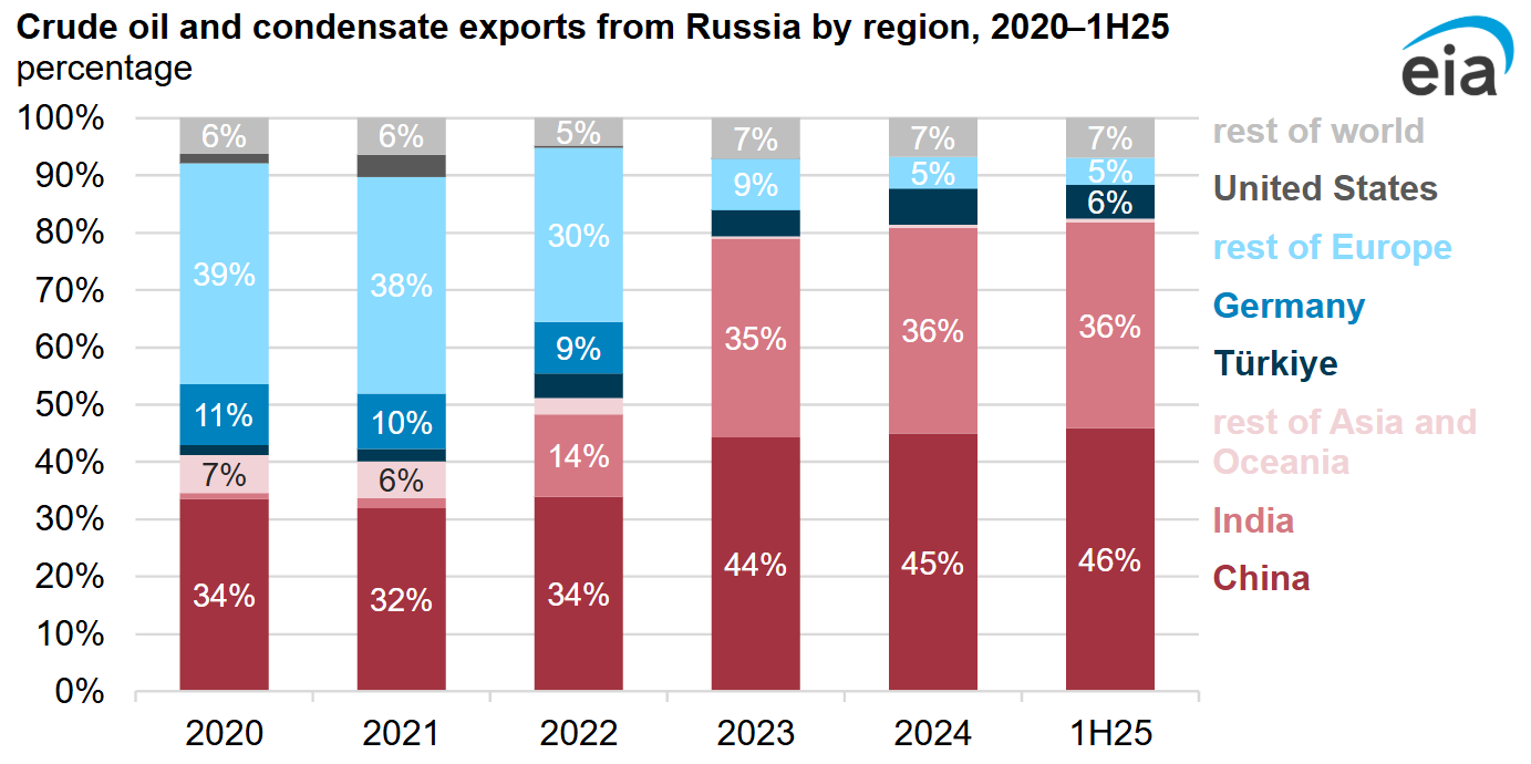 From 2020 to 2024, Russian exports averaged 5.0 million barrels per day (b/d). In the first half of 2025 (1H25), exports fell to 4.3 million b/d—down from 4.8 million b/d in 2024. While overall volumes remain relatively high, the EIA notes a significant reorientation of trade routes due to sanctions imposed after Russia’s full-scale invasion of Ukraine in February 2022.