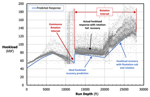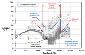 Rotation did not lead to recovery of hookload, and ongoing reciprocation was required, reducing running efficiency in the lateral section. In the example well (Fig. 3), the casing run slowed significantly during rotation over a 7,900 ft interval, even though rotation was originally expected to provide greater efficiency than reciprocation.