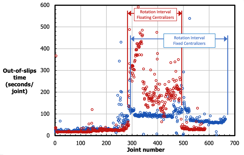 One other advantage that has been seen is more consistent slip-to-slip times per joint during the rotation interval. This predictability can be used to forecast running times and maximize weight on bit right up to TD, further optimizing casing running operations. (Fig. 7) shows the in- and out-of-slips times for the crimped centralizer run introduced earlier. When comparing the out-of-slip running times between the floating and crimped runs in the rotation interval, a vast reduction in running times and an obvious increase in consistency are seen with the crimped solution.